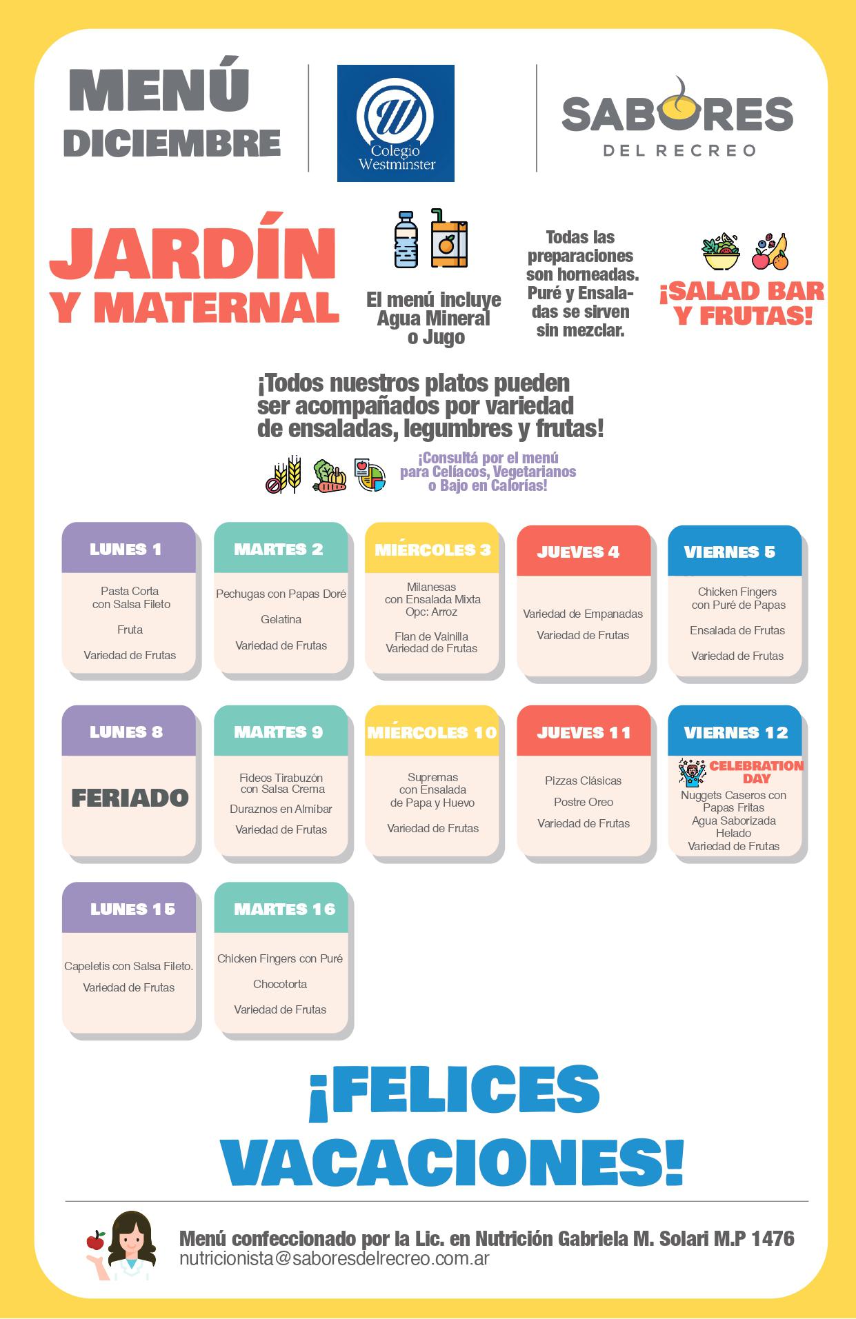 Esta opción es para aquellos padres que desean contratar solamente el menú de un día específico. El pedido puede realizarse, sin excepción, desde las 15 hs del día anterior hasta las 10 hs del mismo día que se consuma el mismo. Todos las opciones de nuestro menú incluyen Agua Mineral/Jugo y Salad Bar de ensaladas, legumbres y frutas para acompañar los platos. Por cualquier duda, consulta o sugerencia puede comunicarse con nosotros vía WhatsApp al 117.192.2022